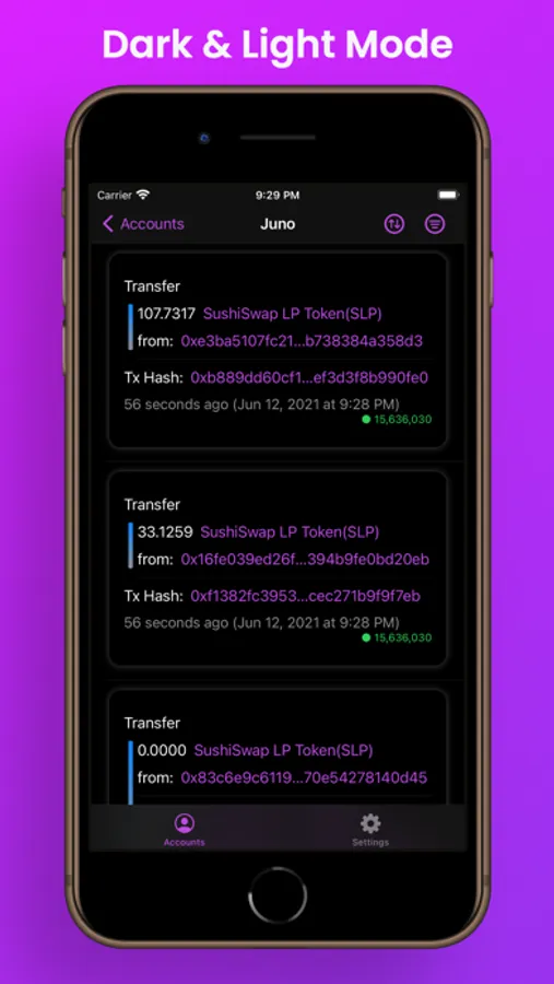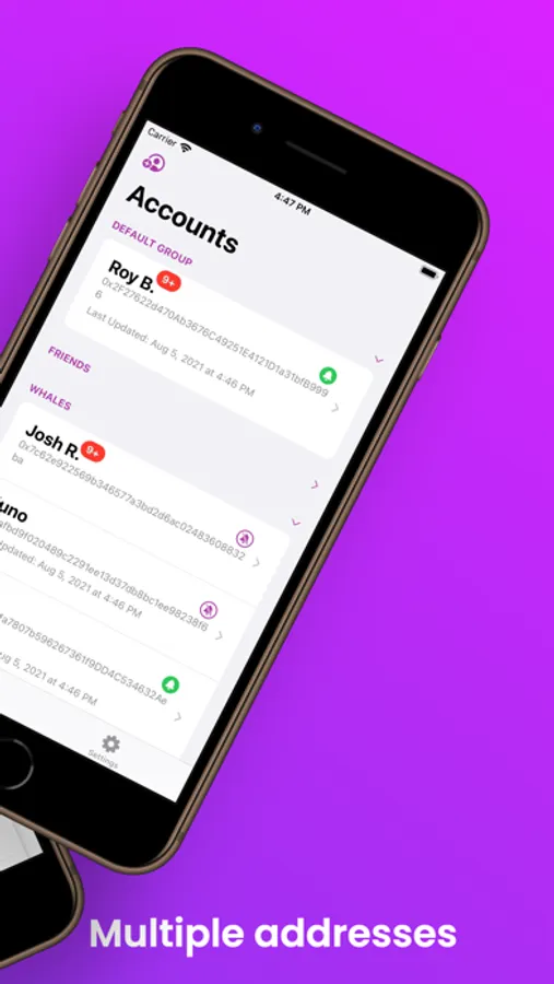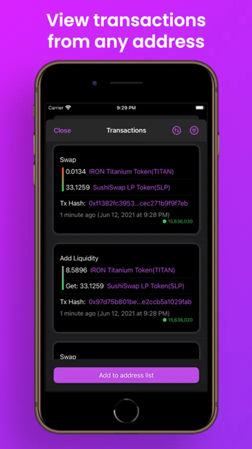 - View transactions of any address within the app and add them to your saved account lists.
