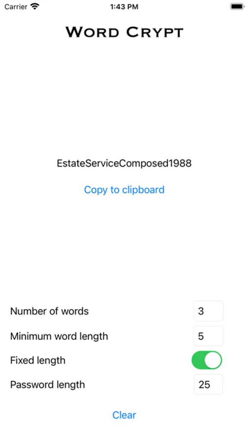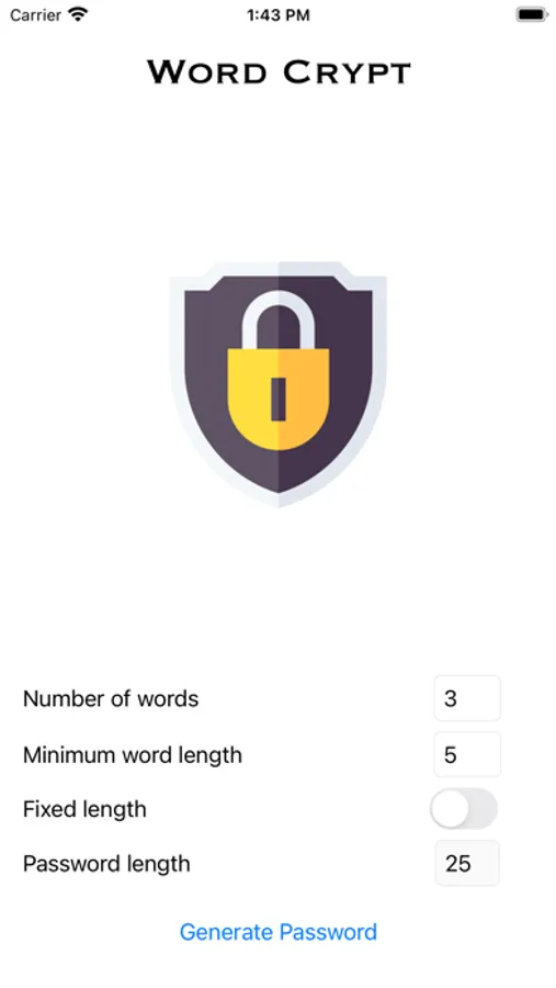 You can specify how many words you want, the minimum number of characters in a word and optionally a fixed length for the entire password.
