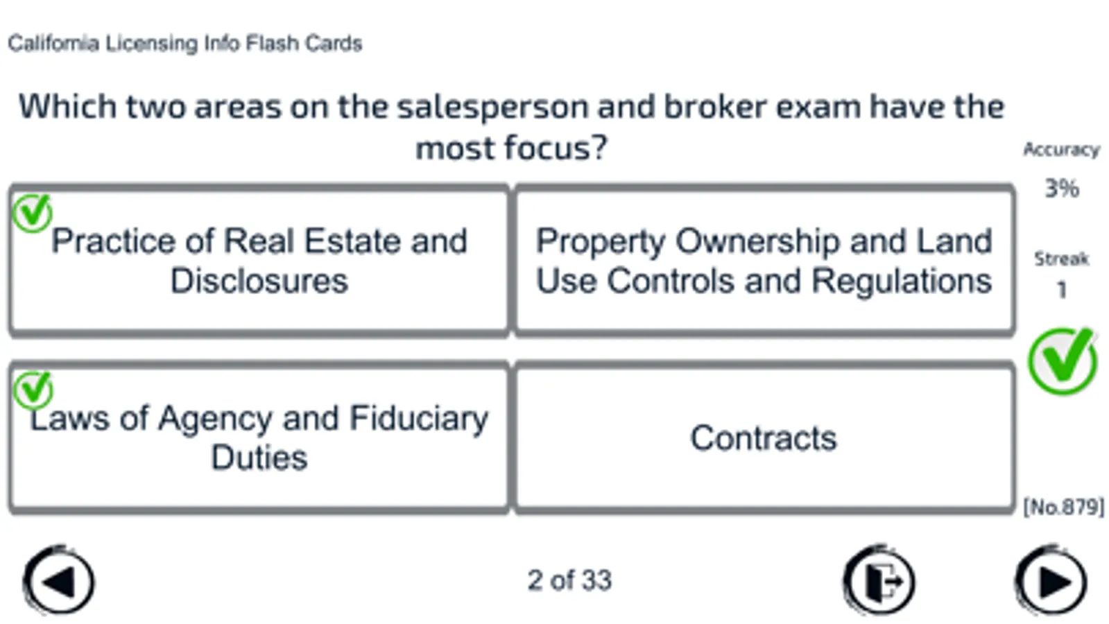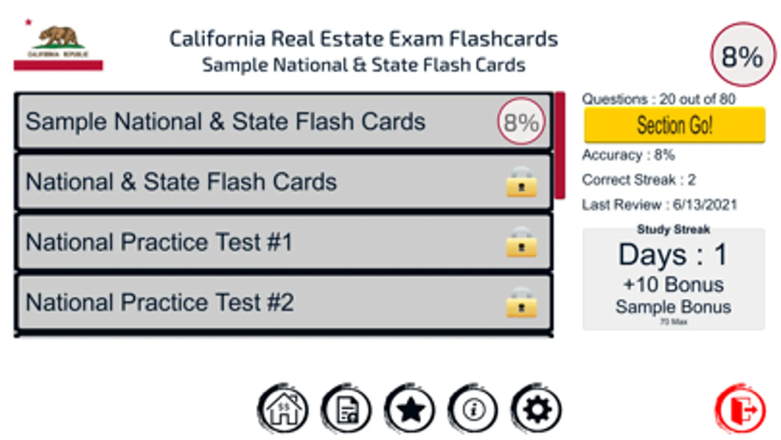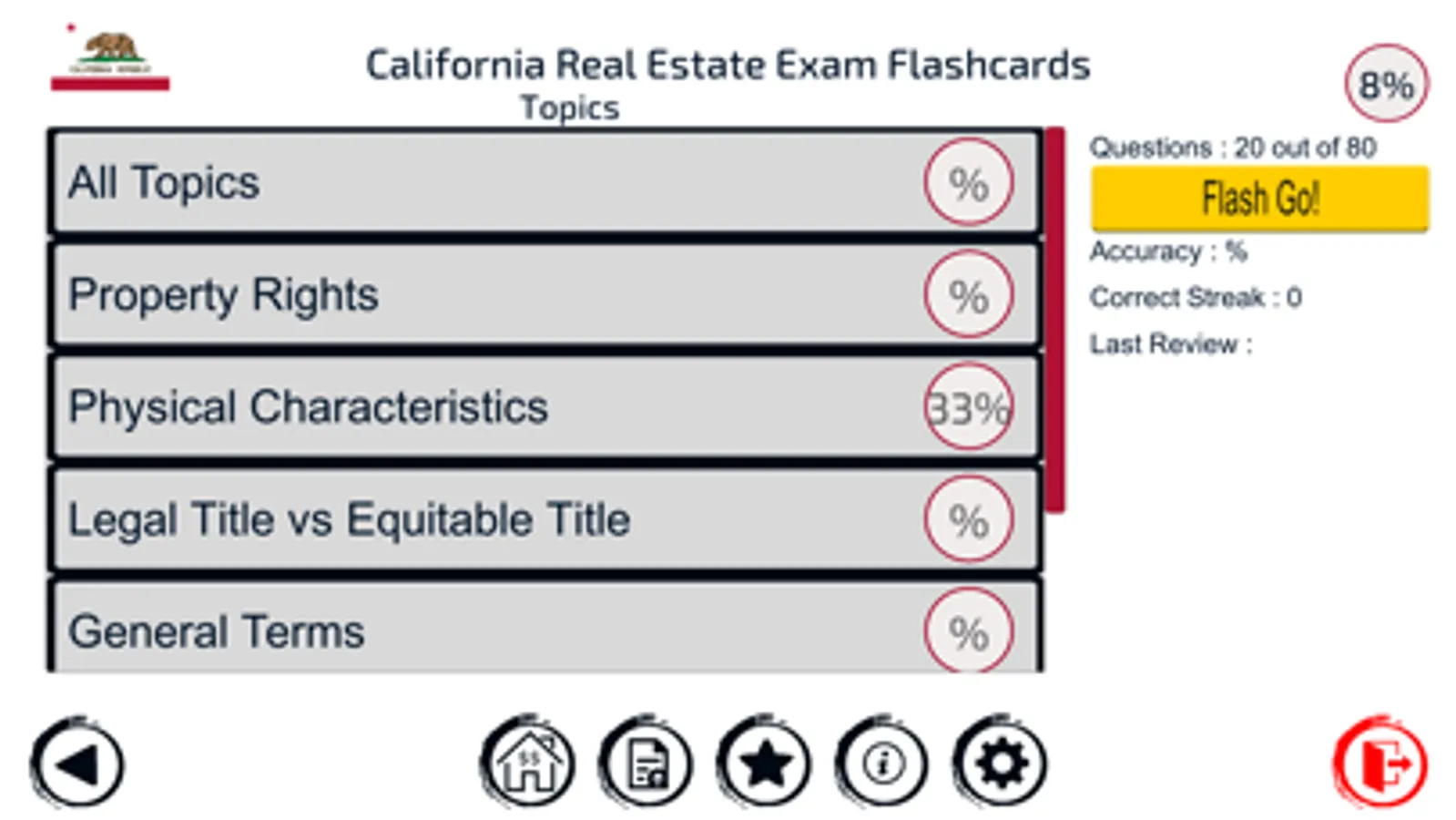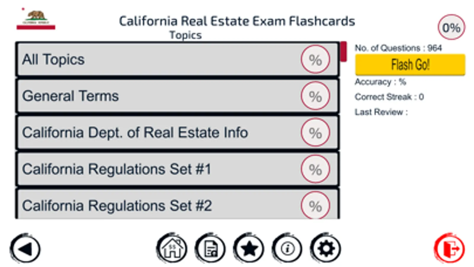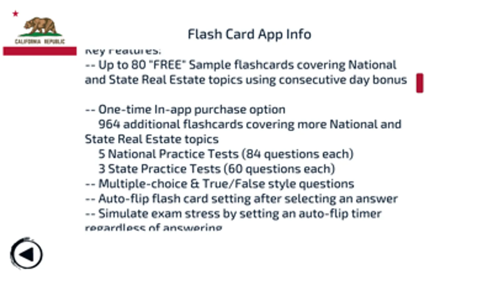 If you are preparing to take the California Real Estate Exam, this app should become your "take with you anywhere, I have an extra ten minutes" study guide. Better than a big book full of highlights and more user-friendly (and realistic) than paper index cards on an old 3-ring, this app combines big book knowledge into an on-the-go, take with you anywhere mobile application.