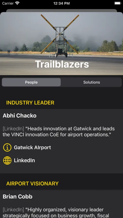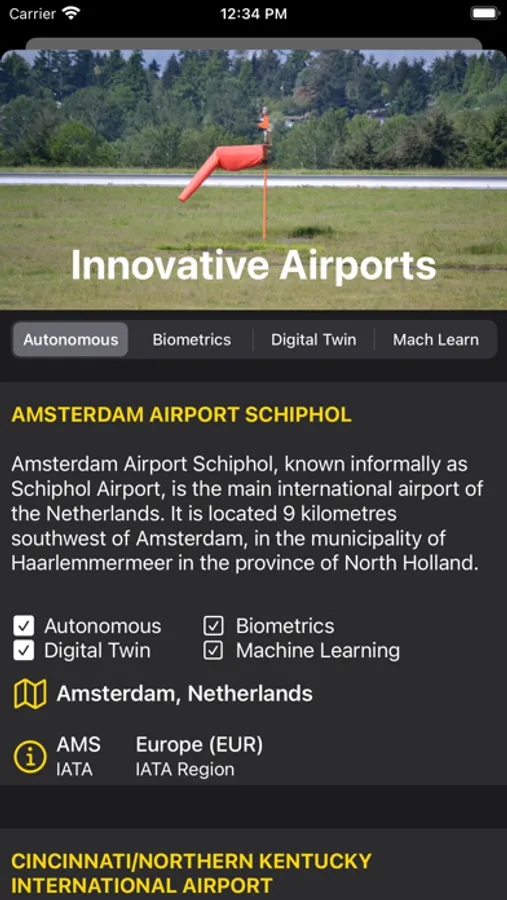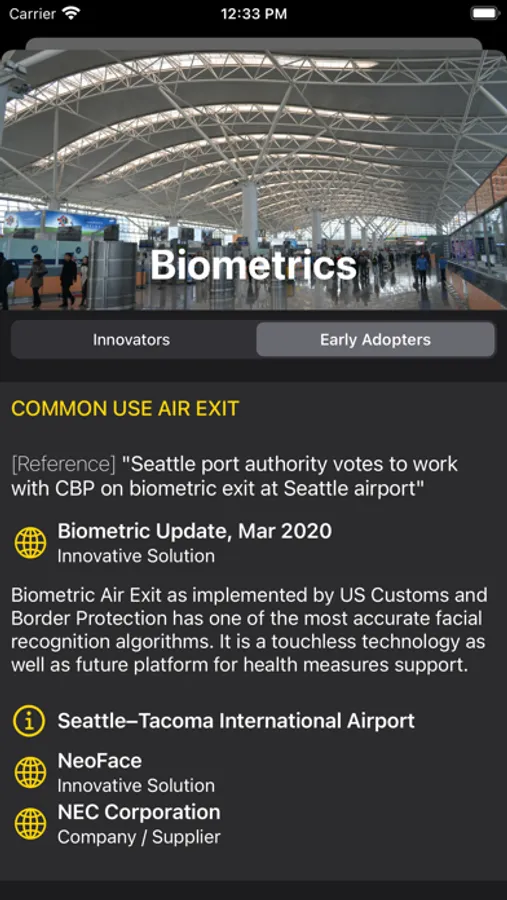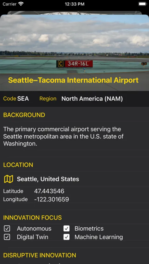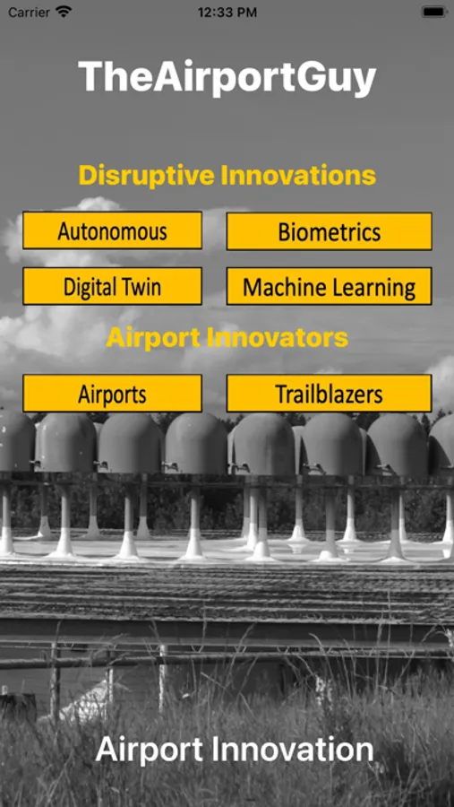 TheAirportGuy app is a resource for airport professionals and members of the aviation industry. Innovative airports and their leaders are identified based on testing or implementation of innovative projects in the following fields: autonomous vehicles, biometric facial recognition, digital twins and machine learning. The analysis ranks the innovations based on innovation dates using Everett Rogers adoption rates: innovators and early adopters. An interactive map illustrates regions of airport industry innovation.