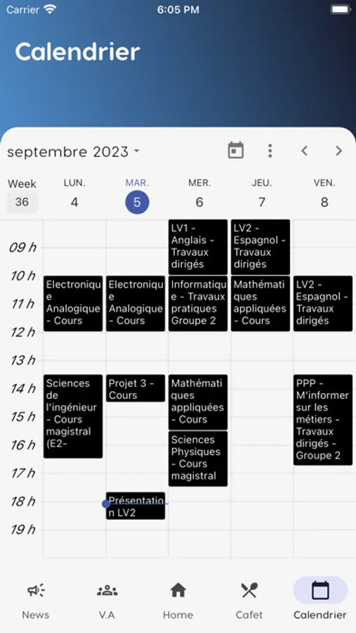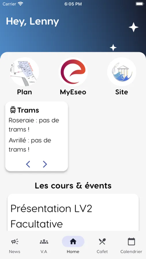 Une dashboard avec votre dernière commande cafet', les horaires de trams et les prochains event de la VA.