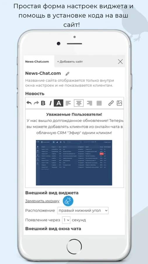 Установка News-Chat, как и других онлайн-консультантов, подразумевает размещение кода виджета в админ-панели сайта. Если у вас нет нужных специалистов мы поможем это сделать абсолютно бесплатно! Для этого откройте страницу Помощь в меню приложения.