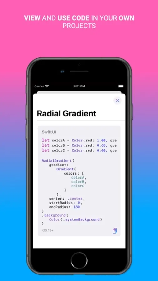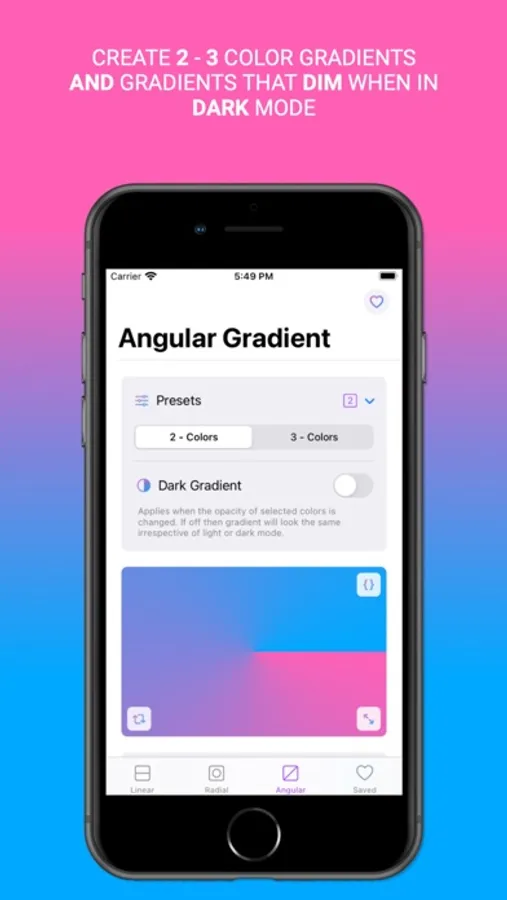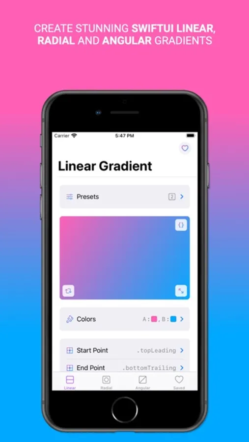 A tool to quickly create stunning linear, radial and angular gradients using 2 - 3 colors, which can be used in your own SwiftUI projects.