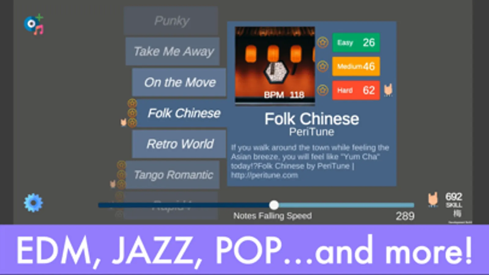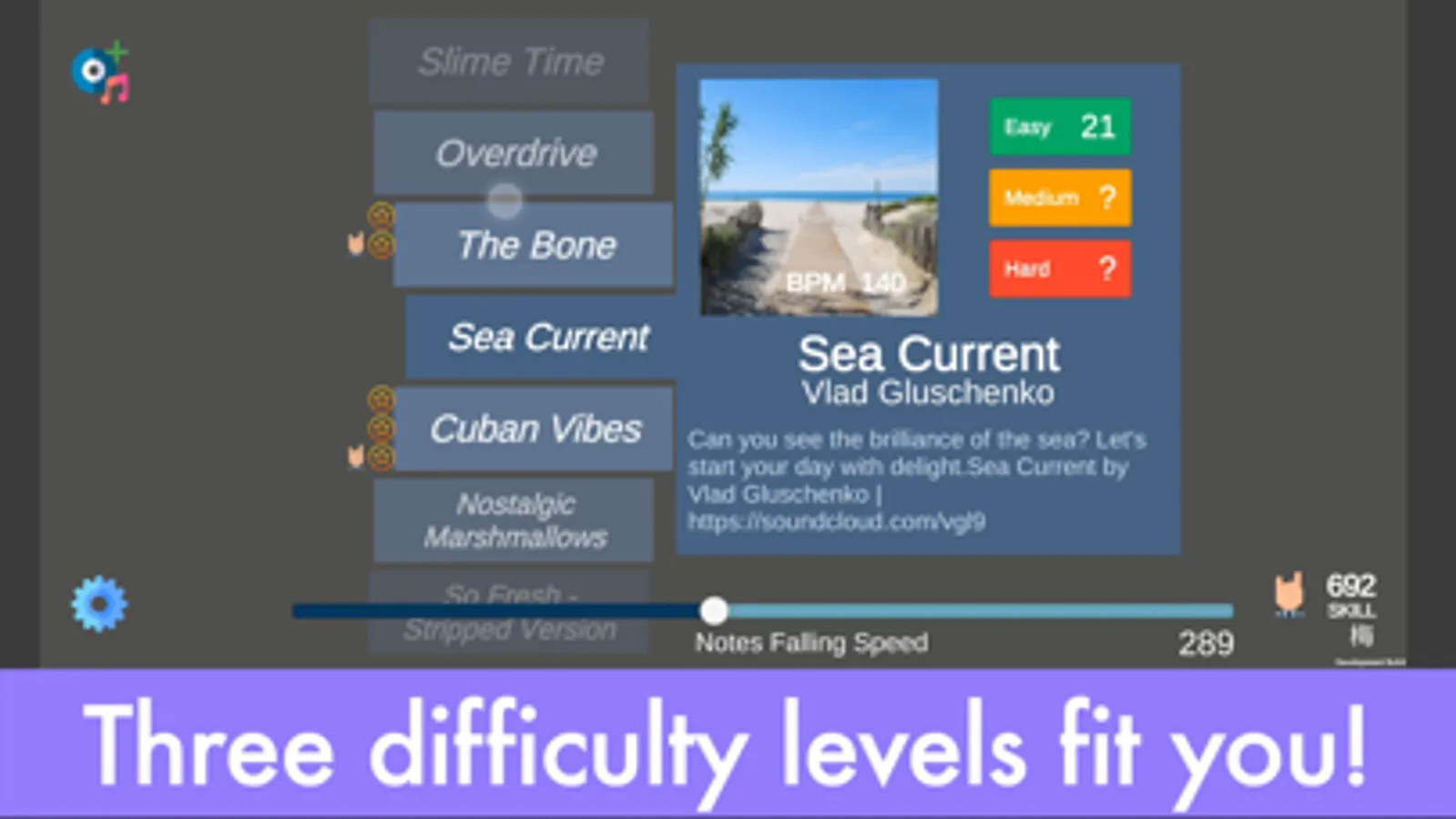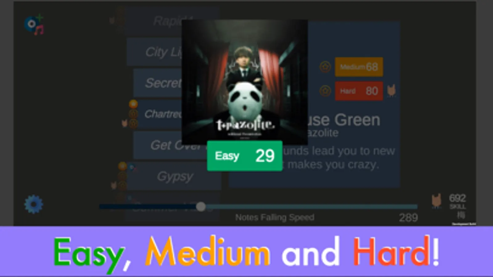 Each music has its own three difficulty play levels (Easy, Medium and Hard). Beginners, rhythm game experienced players and everyone will be able to enjoy playing.