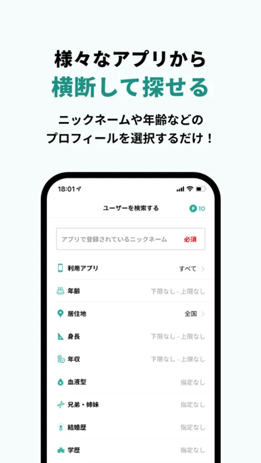 マッチングアプリ名と、「ユーザー名」「年齢」「身長」「年収」などのユーザープロフィール情報から、レビューを検索できます。