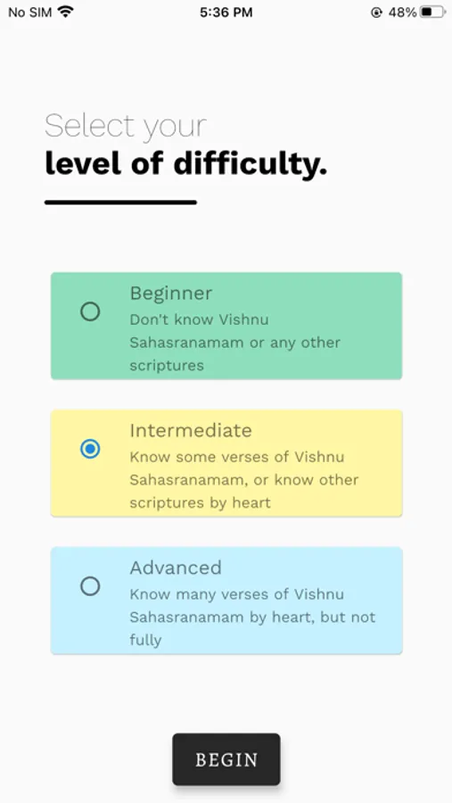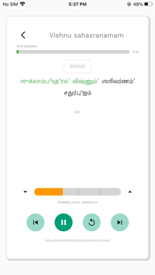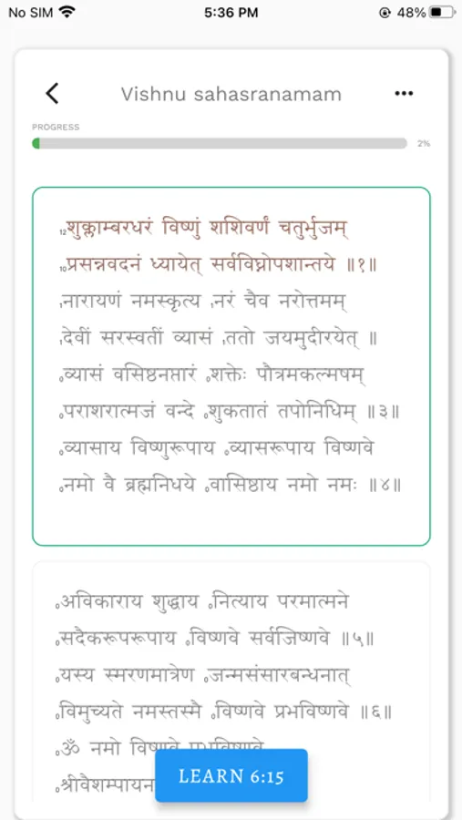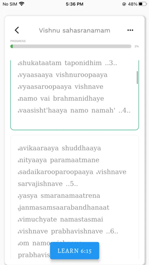 Practice daily in a scientific, systematic way to learn to chant the Vishnu Sahasranamam by-heart. The app breaks up the entire scripture into small lessons. Learn each lesson by reciting phrases after an authentic recording with perfect pronunciation. As you practice more, the phrases get longer to keep you learning. Available with Vishnu Sahasranamam text transliterated in 6 languages - Sanskrit, English, Tamil, Kannada, Malayalam and Telugu.