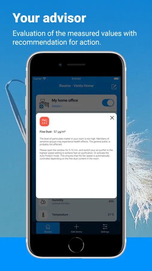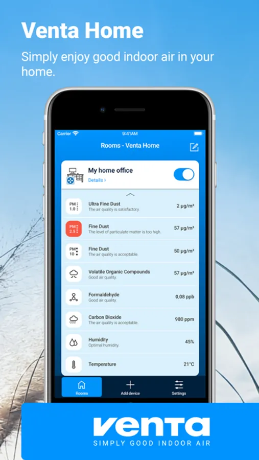 The Venta Home App also supports you as an advisor, because the Air Connect compatible Venta devices specialy the AirSense transmit relevant measured values to the app, so that you can keep an eye on the air data (e.g. carbon dioxide (CO2), formaldehyde, VOC gases, humidity and temperature ) anytime and anywhere.