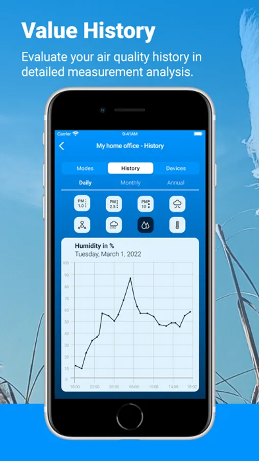 In case of critical values, the app supports you with recommendations for action as well as information on possible causes. Via the up to 6-level color code (according to AQI), it is quickly clear, for example, whether the fine dust content in the air is elevated - then it is time to ventilate vigorously.