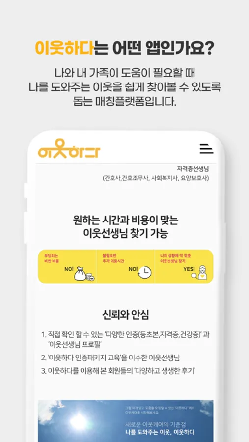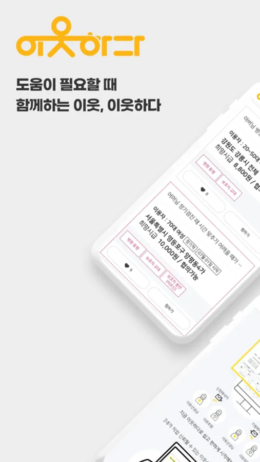 ■ ‘이웃하다’는? 나와 내 가족이 도움이 필요할 때 믿을 수 있는 이웃을 쉽게 찾아볼 수 있는 ‘이웃케어’ 매칭 플랫폼입니다.