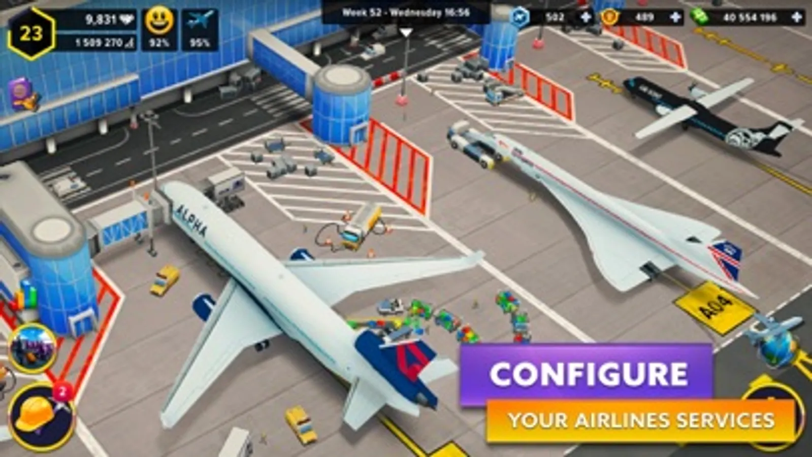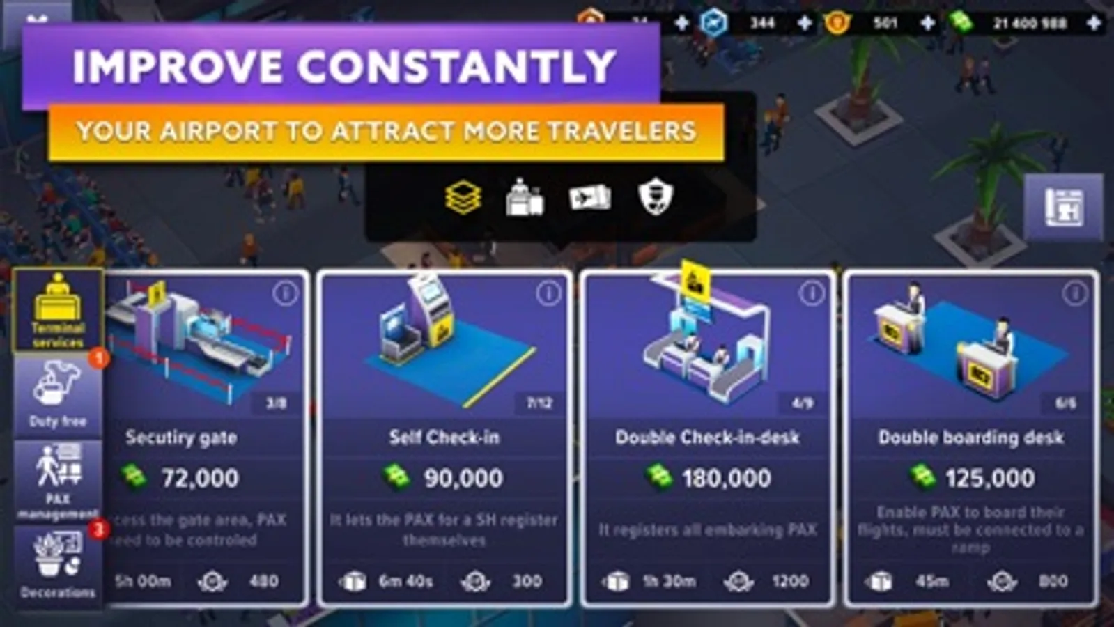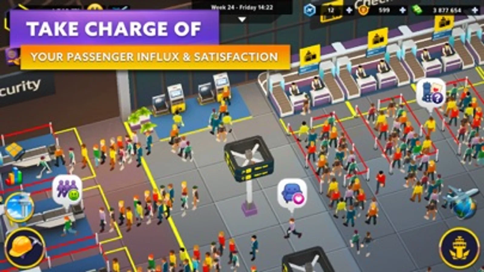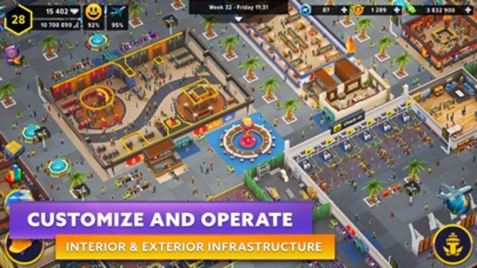 - Strategically arrange your airport infrastructure; build your terminals, including the apron, taxiway, runways, fuel stations, catering production sites, check-in desks, security checkpoints, boarding gates, passport control points, coffee shops, stores and more. You can also choose from a wide range of items to decorate your airport!