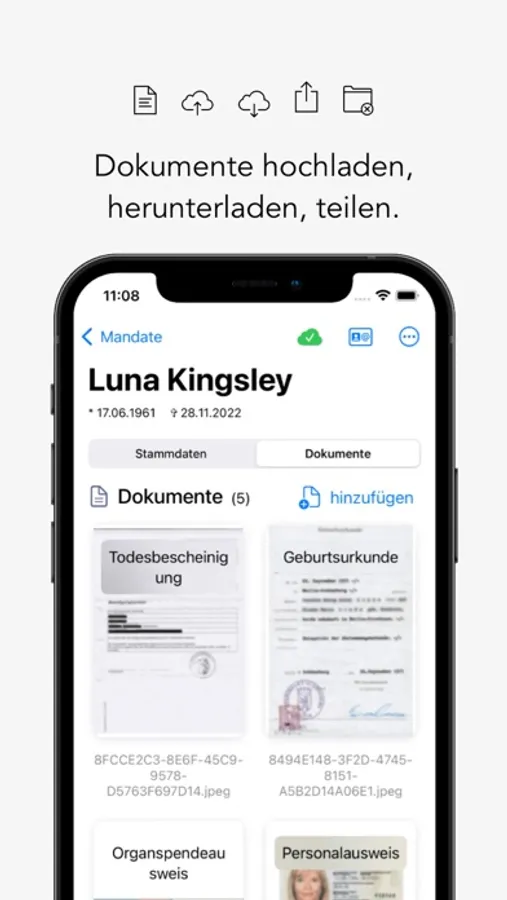 Legen Sie spontan neue Mandate an, erfassen Sie die wichtigsten Daten, laden Sie Fotos und Dateien in den Dokumentenbereich hoch und scannen Sie Dokumente, um statt schlechten Fotos hochqualitative PDFs bereitzustellen.