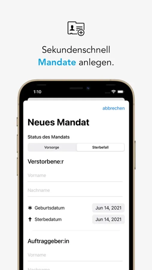 Mit der FMP-Mandate App können Sie als Agent auf dem Funeral Marketplace unterwegs Stammdaten und Dokumente Ihrer Mandate verwalten: Daten erfassen, Dokumente hochladen, herunterladen, teilen, löschen.