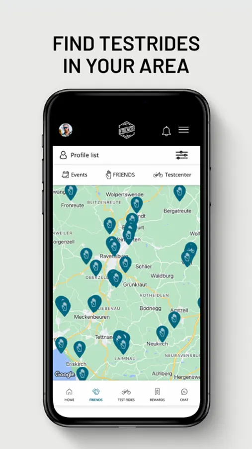 Even if you don't own a PROPAIN bike, you can download our app and register. If you don't have your own PROPAIN bike yet, become a test rider. You can access the latest PROPAIN news in our app, find test ride opportunities in your area using the interactive map in the "FRIENDS" section, and contact FRIENDS via chat if you would like to test-ride a bike.