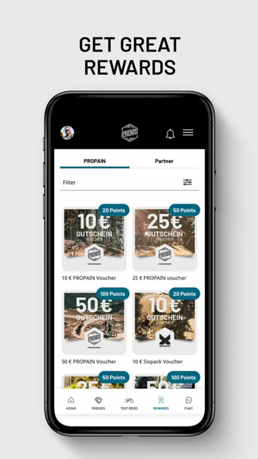 Anyone who wants to become part of the PROPAIN community can become a member. As a test rider you have the possibility to find FRIENDS (PROPAIN bike owners) in your surrounding and request test rides. As a FRIEND you get, after successful verification of your registered bike, exclusive access to our FRIENDS area and can exchange collected points for great rewards.