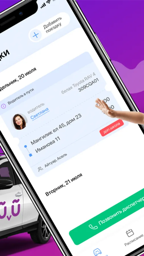 Удобное приложение, где родитель может вносить изменения в расписание ребенка и отменять поездки в случае необходимости, видеть статус поездки и получать push-уведомления. За всеми поездками родитель может следить в приложении в реальном времени.