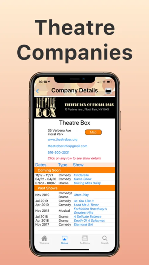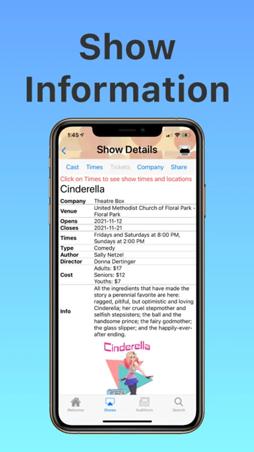 • Get all the show details, including the company name, show dates, ticket cost, how to purchase tickets, a description of the show, and a cast list