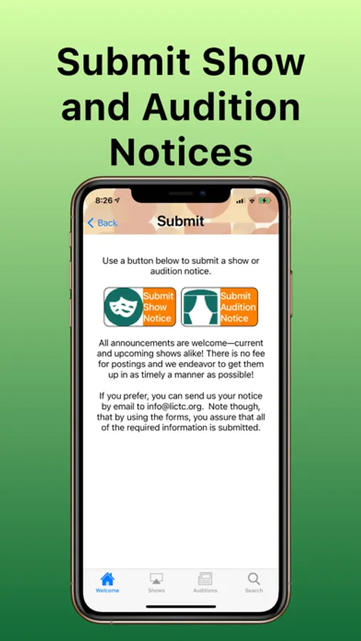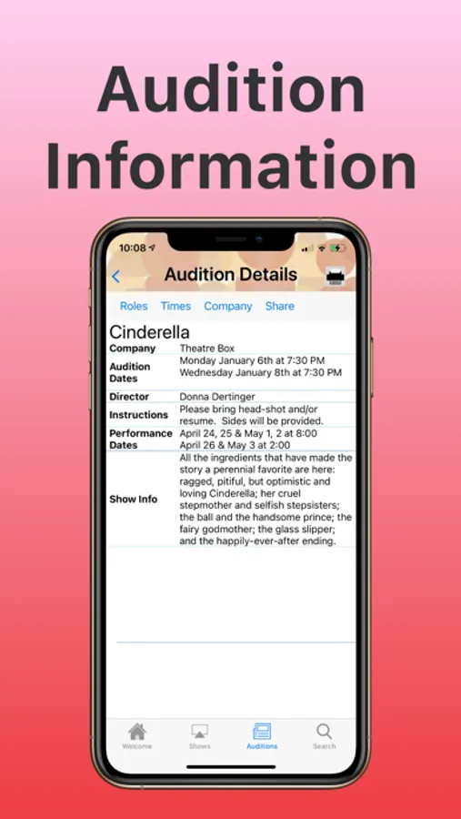 • For each of the auditions, learn more about the director, audition instructions, performance dates, rehearsal information, and a show description