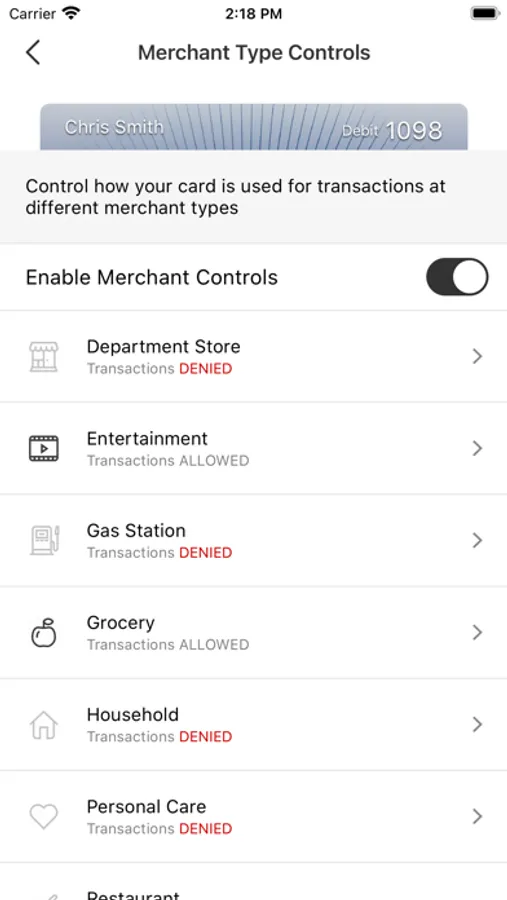 such as gas stations, department stores, restaurants entertainment, travel, and groceries. And your transactions can also be monitored for specific transaction types: in-store purchases, e-commerce transactions, mail/phone orders and ATM transactions.