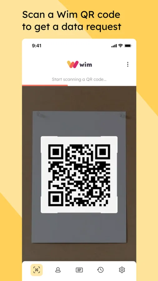 Wim provides a single-app solution to transact data easily and securely with businesses that promote Wim QR codes, like at hotel check-in, registering to an event, visiting a doctor or signing up to a service.