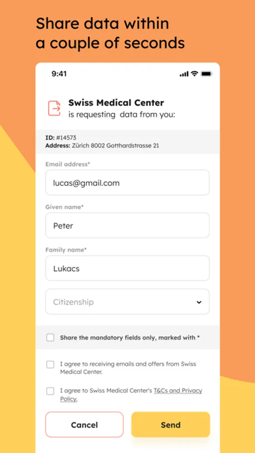 Wim gives you a clear overview of what data is requested. You have the freedom to easily edit entries, consent to usage of data and send privately what you want to share.