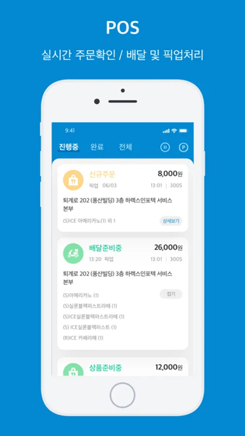 직원도 주문을 접수/처리할 수 있도록 등록/관리 메뉴를 제공합니다.