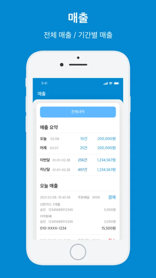 기간별 매출조회 및 주문건수, 주문금액 집계와 결제수단 별 매출 조회가 가능합니다.