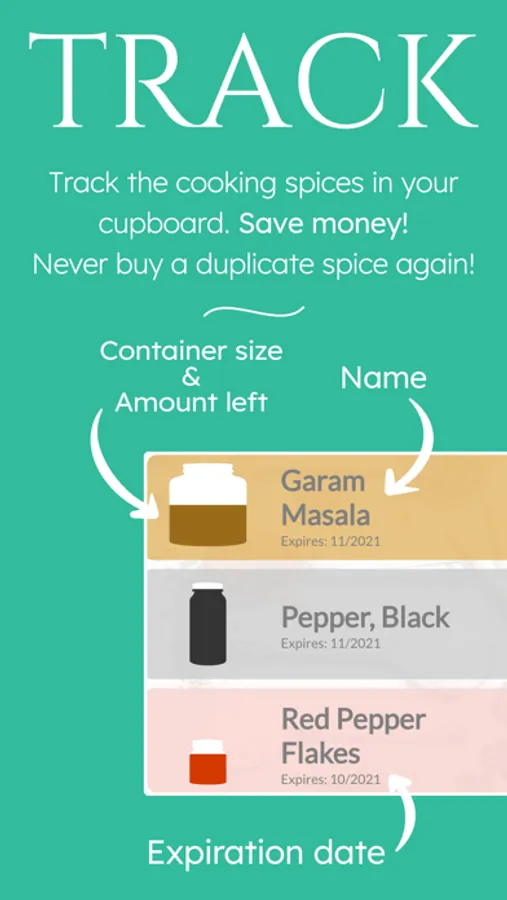 - Saves you money! Always know which spices you have on hand and how much is left in the bottle, so you don't buy too much. Saves you from having 3 full jars of thyme in the cupboard.