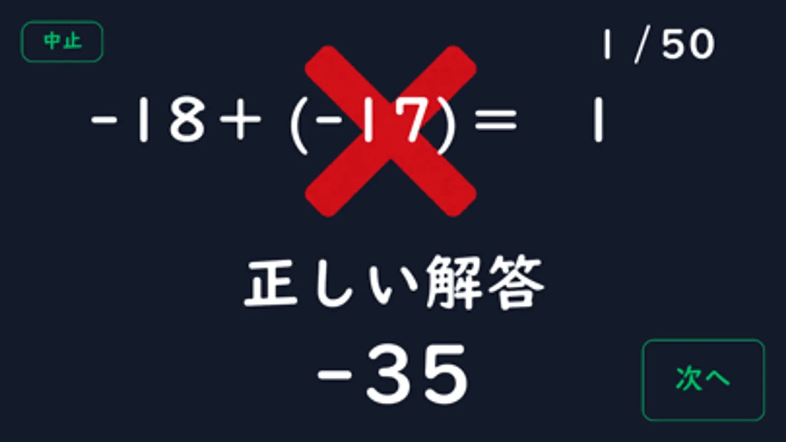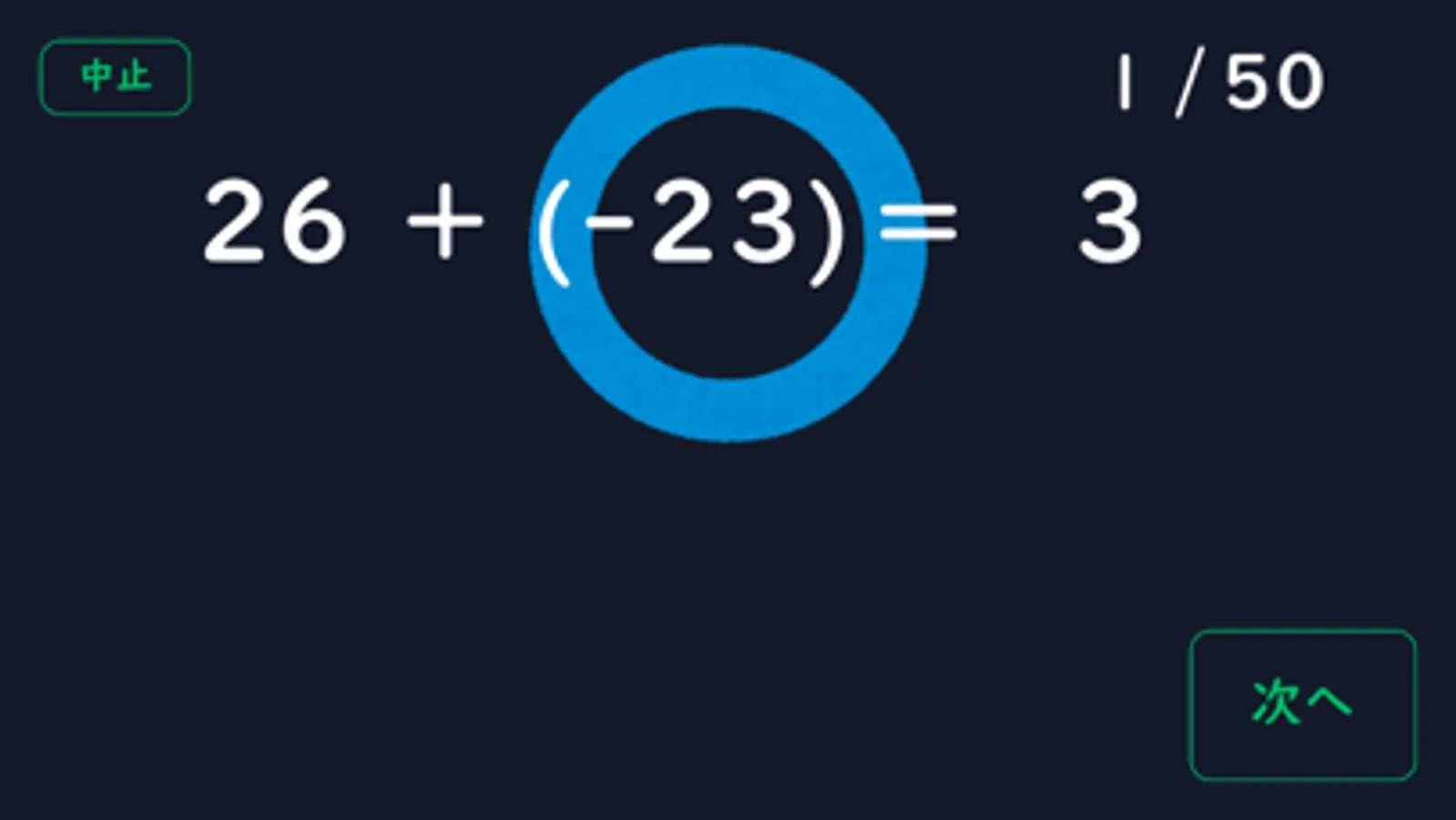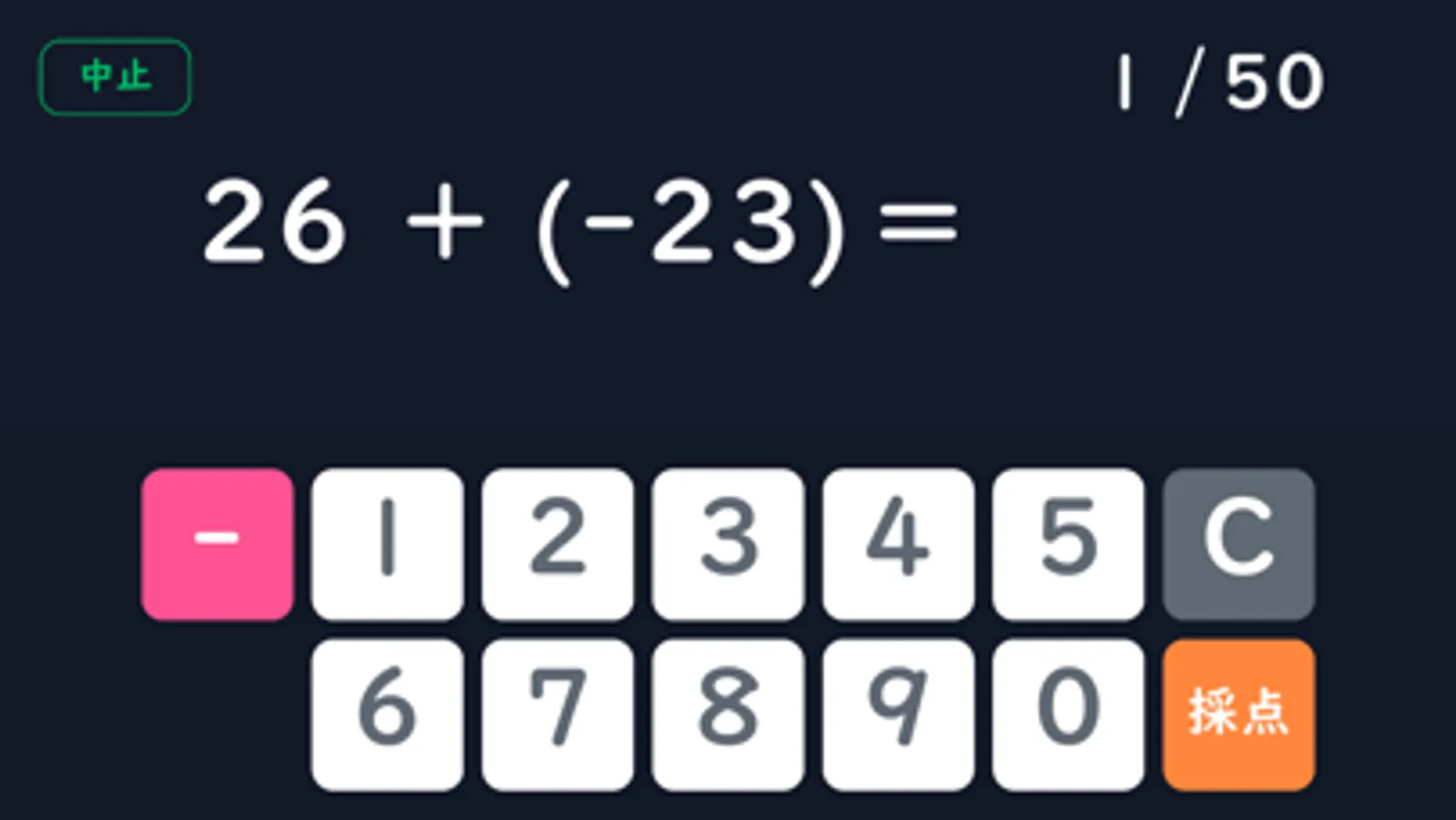 中学1年生の数学で学習する、正の数・負の数の計算を練習するアプリです。