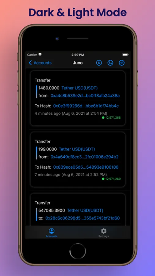 - View transactions of any address without leaving the app and also add them to the saved account lists if you want;