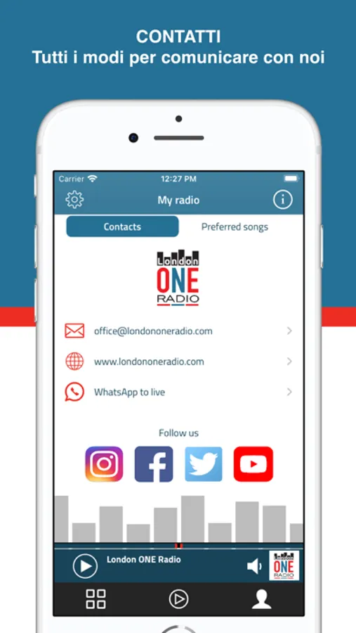 L'app di London ONE radio è il primo "ponte radio" che unisce il Regno Unito all'Italia e che ti tiene compagnia anche in auto grazie alla modalita' Carplay per ascoltarci comodamente anche quando sei alla guida.