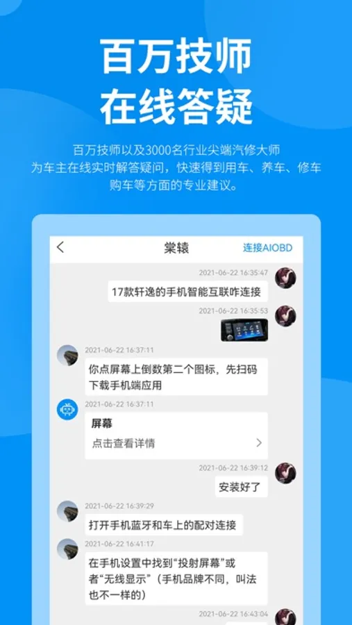 百万技师以及3000名行业尖端汽修大师,为车主在线实时解答疑问,快速得到用车、养车、修车、购车等方面的专业建议。