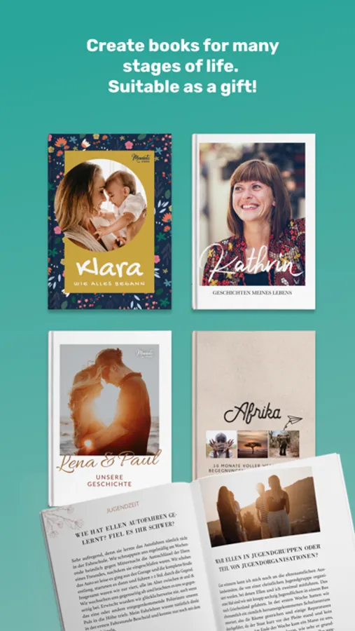 With Meminto, you get creative at the touch of a button as we ask you questions about your whole life. Whether you're already retired and want to write an entire biography or just want to start with your kids growing up. You can also record your relationship together with your partner in a book - from getting to know each other to your wedding day. Or should it be about your last big trip? With Meminto it's all possible - even post mortem. Because with us you can also create very special mementos of deceased friends or family members.