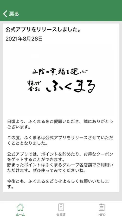 山陰の地産地消をテーマに飲食店を展開する株式会社ふくまるグループのポイントカードアプリです。