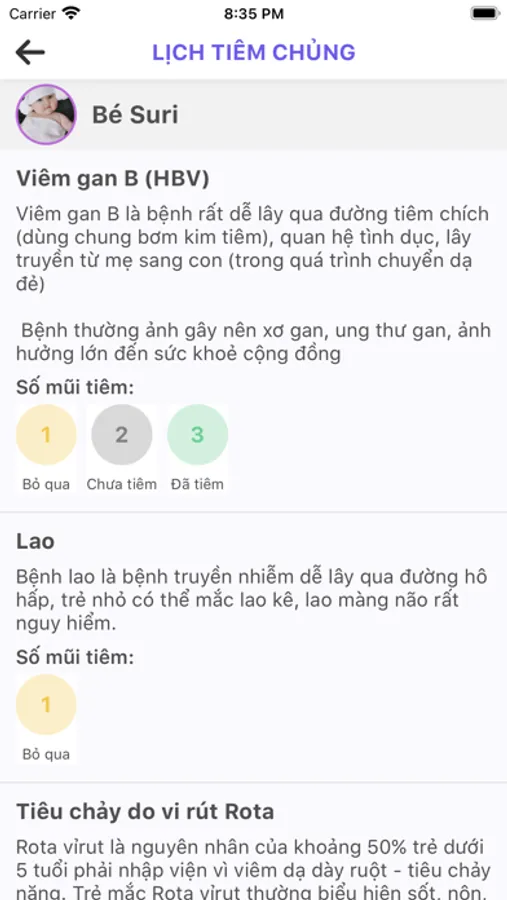 - Ghi lại lịch tiêm, danh sách các mũi tiêm phòng và thời gian tiêm phù hợp cho bé