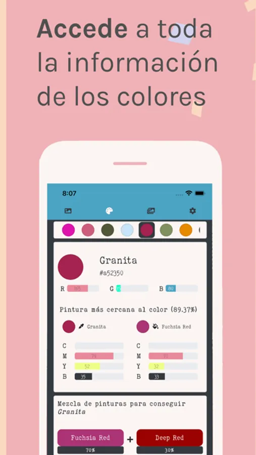 Selecciona los colores de tu imagen o foto que tengas en tu dispositivo y accede a toda la información para saber qué pintura has de escoger y como mezclarla para conseguir un resultado perfecto.