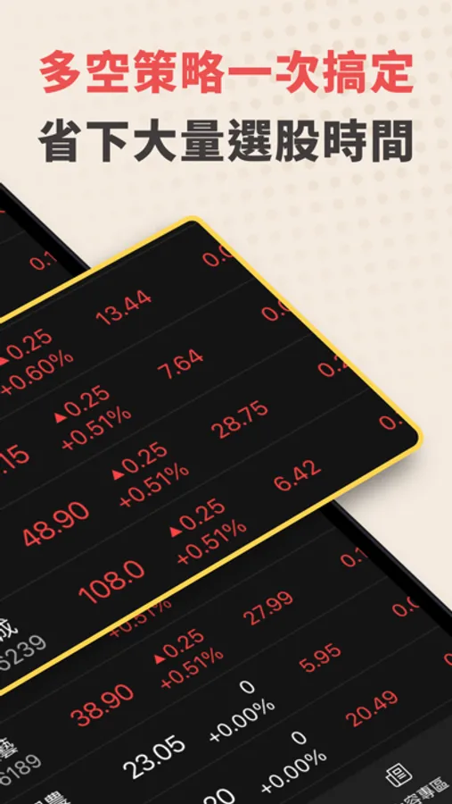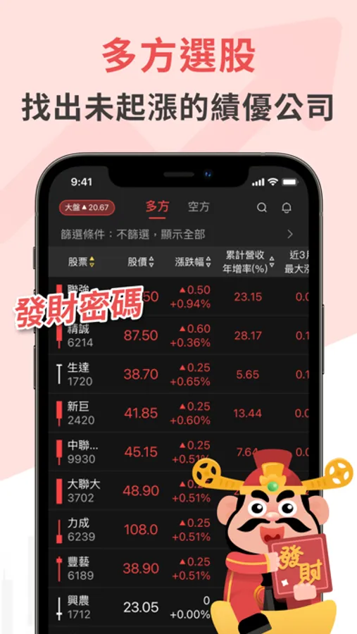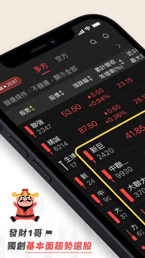 ► 發財1哥APP內建《選股》功能,以【基本面趨勢選股術】作為篩選標準,並區分為多、空各1種策略,操作簡單明瞭,能讓你輕鬆應對不同盤勢,隨時更新口袋名單!
