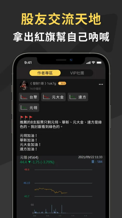 ► 除此之外,APP還內建《社團功能》,不只有作者專區能讓各位同好互相交流切磋,發財1哥也會定期更新行情整理、個股追蹤、產業趨勢等資訊;若加入VIP私密社團,還可以隨時收到【1哥概念股】的最新狀況,再也不用怕錯過任何一個獲利機會!