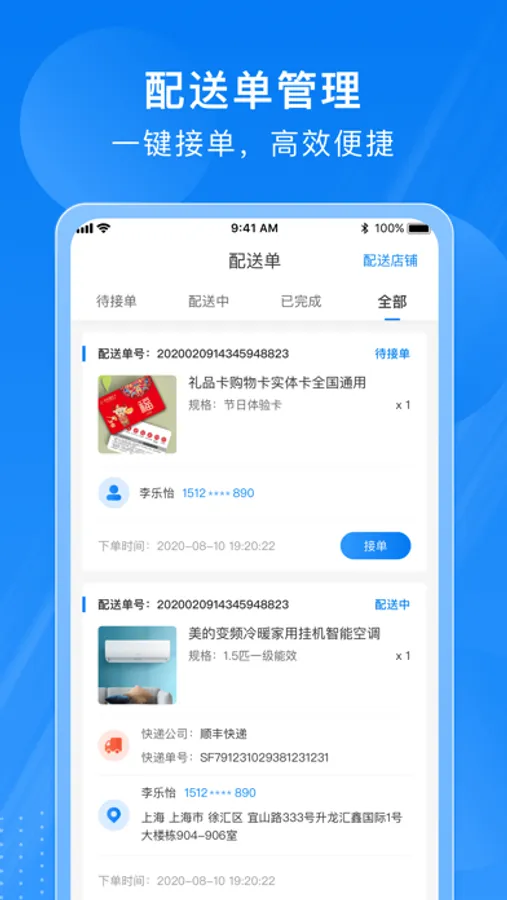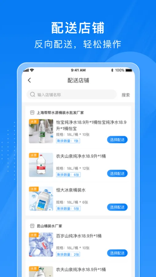 为桶装水送水公司设计,可以从商场商户接取送水服务订单的App,适用于送水公司。