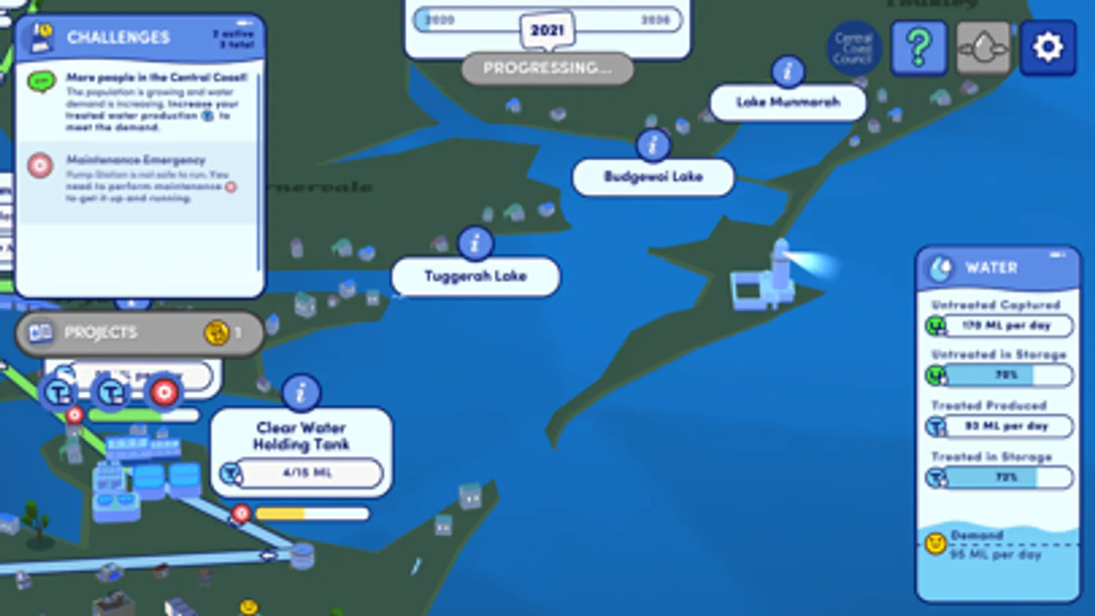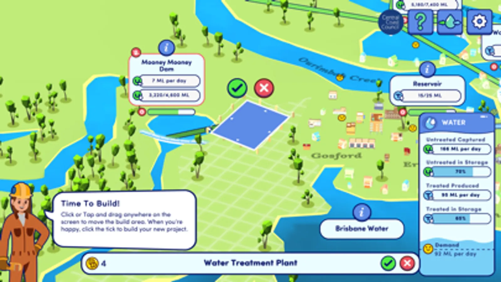 Taking place on the Central Coast of New South Wales, Australia, where the need for clean drinking water increases as the community grows, and the player is responsible for building new infrastructures to meet the increased demand.