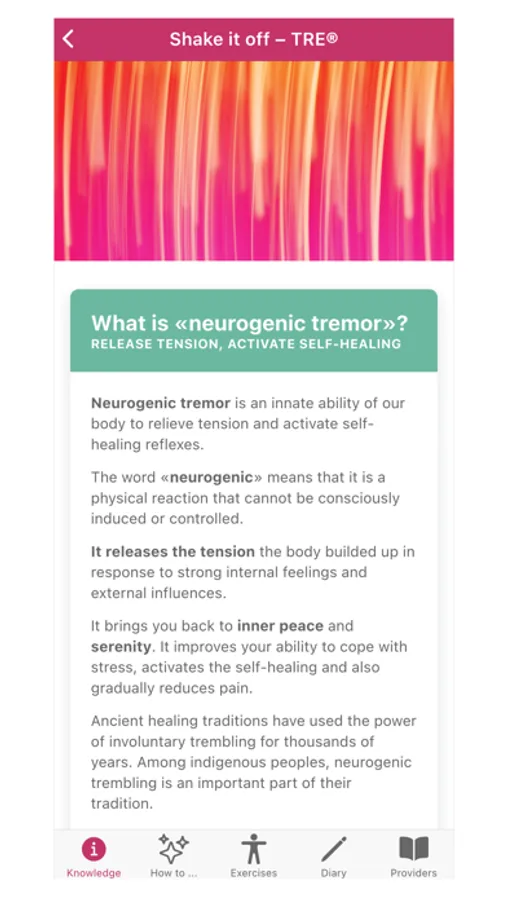 Neurogenic tremor is a self-healing reflex of our body, an innate ability to overcome trauma, release tension and stress reactions and thus let go of pain.