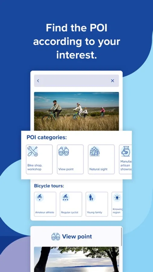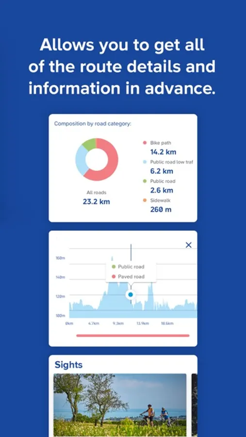 You can choose from the 48 touring routes we have compiled to suit your needs, but you also have the option to create unique, personalized itineraries and store them in the app. You can compile these routes according to different aspects. You may be able to put together a suitable mountain, road or pleasant bike tour for your bike. But it is also possible that you want to cycle through castle ruins and trendy gastronomic places of the area as part of your bike tour, and by entering them, you ask the app to compile the route for you ...