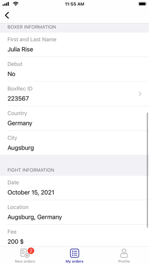 Detailed information can also be given on the details of the fight. For example, a fight fee is set, as well as the location and country of the fight in which it is to take place.
