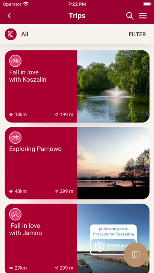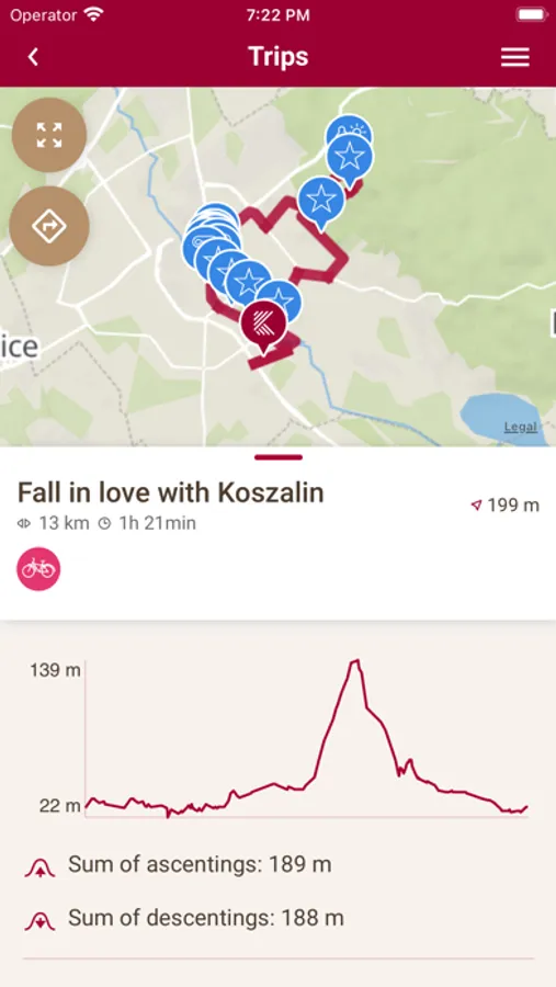 You can download the routes to your mobile device and use them even when you’re offline. The GPS module will display your exact position on the map. The routes include the objects and places of interests with descriptions and photographs. On the map, you will also see places and facilities for cyclists, such as bike parking lots, repair workshops, rental shops or cycle stores.