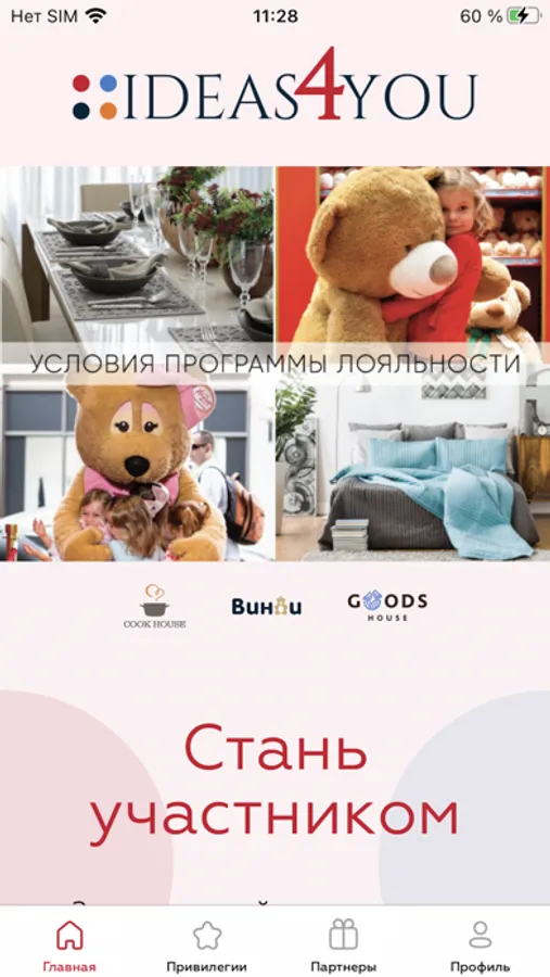 С приложением Ideas 4 You вы будете всегда в курсе событий и акций известных брендов Hamleys, Cook House, Goods House и Винни. А также сможете контролировать свой бонусный счет.