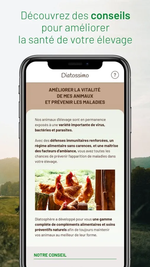 Diatossimo vous aide à identifier les maladies de vos animaux de basse-cour et à trouver les soins naturels adaptés à votre situation. A travers un processus simple et très efficace, vous allez en quelques minutes obtenir des réponses fiables quant à la santé de vos animaux, et appliquer les conseils qui vous permettront de soulager vos animaux. Lorsque l'on souhaite soigner naturellement ses animaux de basse-cour, il peut être difficile d'identifier les troubles causés par les parasites, virus et bactéries qui affectent les volailles et les lapins. Diatosphère, spécialiste des soins naturels pour animaux, a développé Diatossimo pour vous aider à comprendre les problématiques et appliquer les solutions naturelles adaptées. Vos poules ont arrêté de pondre ? Votre lapin a des problème de transit ? Diatossimo vous accompagne dans la prévention et les soins de vos animaux à travers des conseils d'élevage et des articles détaillés qui vous aideront à soigner vos animaux naturellement et efficacement, dans le respect de l'environnement.
