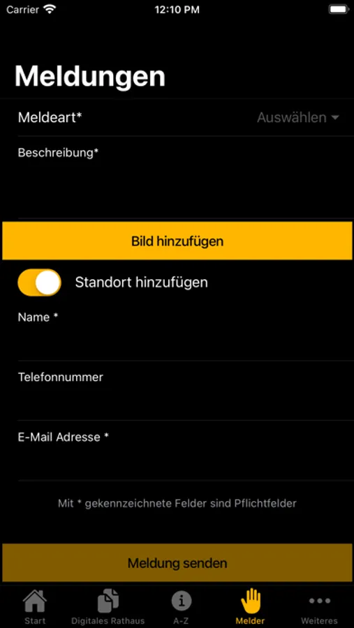 * Melder - Ihr direkter Draht zu uns (Senden Sie und z.B. Straßenschäden, Vandalismus oder allgemeine Rückmeldungen zum Gemeinde Leben)