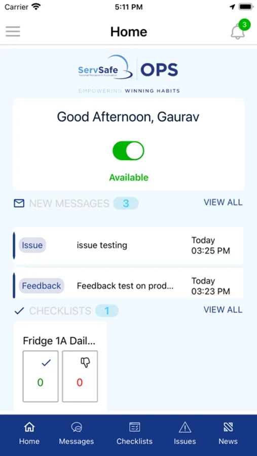 The ServSafe Ops App is used by restaurants to complete key day-to-day Tasks, receive Messages and Alerts, manage Issues, access Standard Operating Procedures (SOPs), view noteworthy News items, and complete assigned Training.