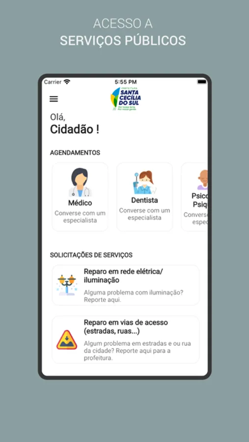 O aplicativo Santa Cecília do Sul oferece ao cidadão a possibilidade de realizar agendamento de consultas na área da saúde e solicitações de serviços e melhorias de maneira muito simples e prática, tudo através do aparelho celular;