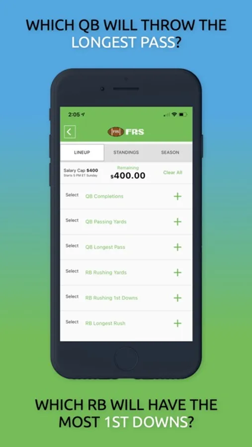 Fat Richie Sports (FRS) is the first Daily Fantasy Sports provider to offer you stats like Longest Pass, Longest Rush, and inverted stats like Least Yards or Least Points, giving you the most versatile fantasy experience ever. With FRS you no longer have to analyze a player's entire forecast to win; simply read the stat and choose the player who you believe will do best for that one stat. Receive fantasy points and rank against the competition.