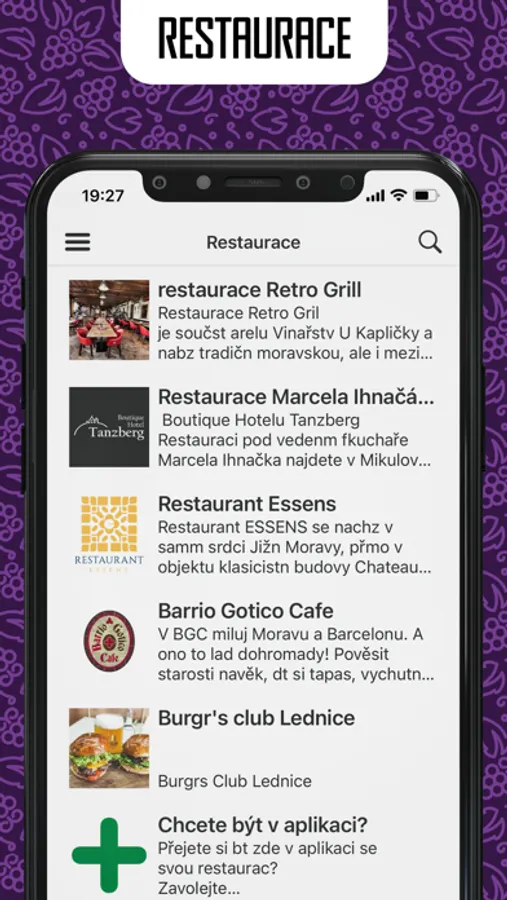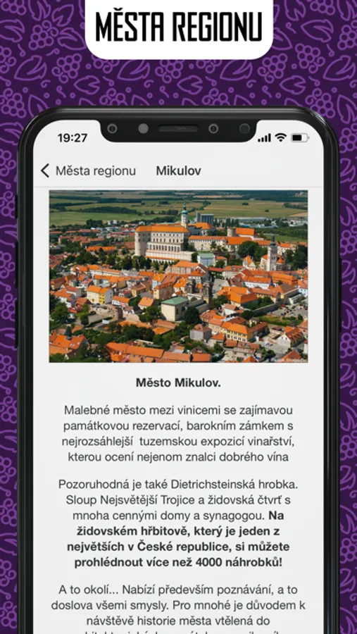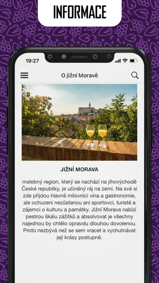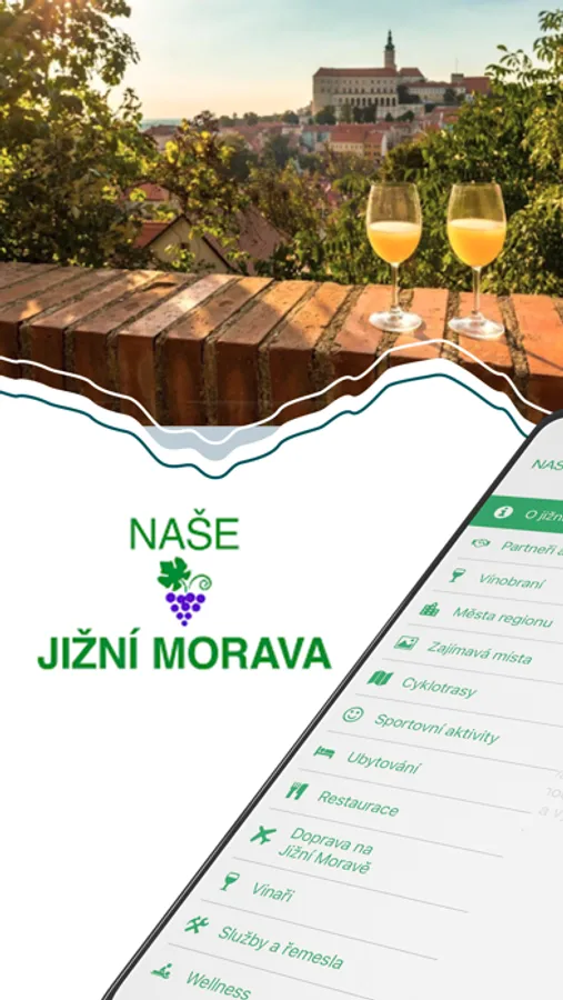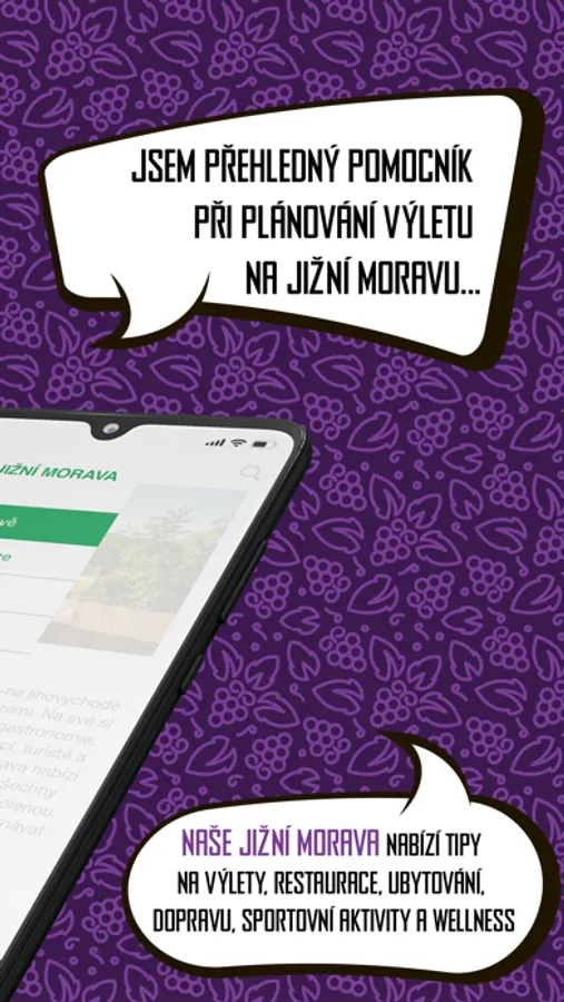 Aplikace NAŠE JIŽNÍ MORAVA je skvělým pomocníkem nejen pro turisty. V aplikaci naleznete města regionu, restaurace, vinařství a ubytování v okolí. Aplikace obsahuje nápady na sportovní aktivity či tipy na výlety. Najdete v ní také aktuality, informace o dopravě a službách.